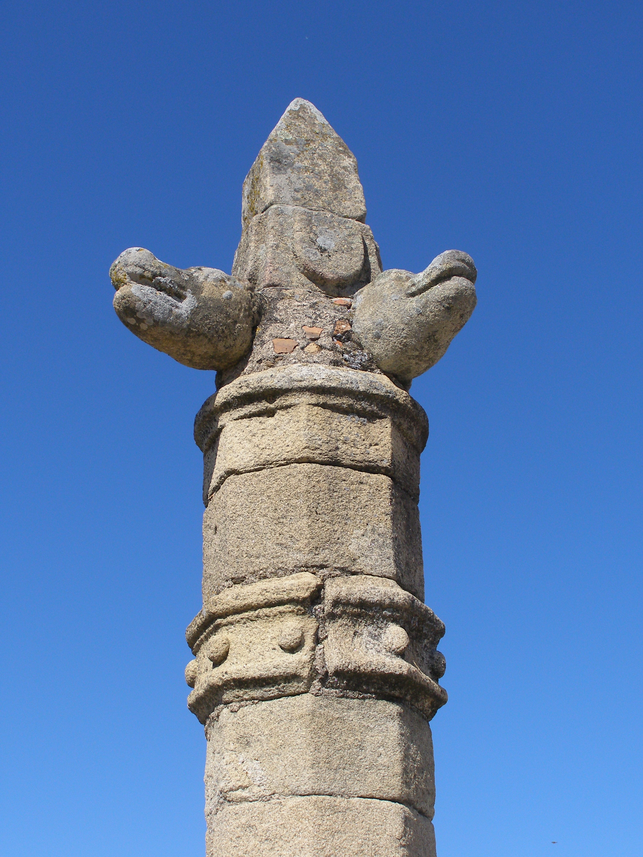 El Rollo-Descripción: hito jurisdiccional de granito de la zona de unos 3,5 metros de altura total. Presenta fuste ochavado compuesto por varias piezas, sustentado el conjunto sobre escalinata de cuatro peldaños. Aparece coronado por una pieza granítica en forma de punta de diamante, apoyada sobre otra de forma cúbica de cuyas caras sobresalen escudos sin armas, y entre esta pieza y el fuste un cuerpo formado por dos cabezas de lobos o jabalíes y una ménsula.